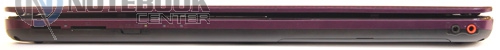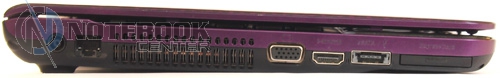 Первым на левом торце расположилось гнездо для подзарядки. Рядом с ним находится сетевой разъем RJ-45 и вентиляционное отверстие для отвода горячего потока воздуха. Левую грань продолжает 15-контактный аналоговый видеовыход. С помощью VGA можно свободно подключить внешний монитор. Сразу возле этого интерфейса располагается 19-контактный цифровой порт HDMI. Он обеспечит передачу аудио- и видеосигнала. Помимо этого, через интерфейс HDMI можно вывести изображение стандарта «Full HD».