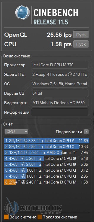 Еще один «инструмент» - тестовое приложение Cinebench R11.5 позволит оценить быстродействия центрального и графического процессоров. Cinebench R11.5 выдал следующие результаты: OpenGL – 26.56 fps, CPU – 1.58 pts.