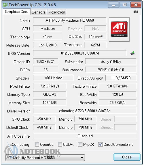 Также модель тестировалась в PC Mark Vantage (с разрешением 1024х768 пикселей). Общий показатель тестирования составляет 5332 балла. Более подробный результат можно увидеть в таблице.