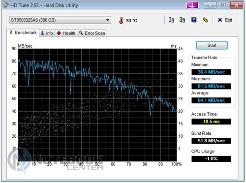 При помощи программы HD Tune можно получить полную характеристику дисковой системы. В данном случае, тестируя ноутбук Sony VAIO VPC-EA3S1R, мы получили следующие результаты. Минимальная скорость передачи данных – 36.4 Мб/c, максимальная скорость передачи данных – 81.5 Мб/с, средняя скорость – 64.1 Мб/с, время доступа – 18.5 мс, скорость съемки – 51.8 Мб/с.