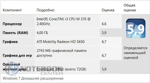 В целом, тестовый пакет, встроенный в операционную систему Windows 7, оценил производительность следующим образом. Получено 5.9 баллов, которые определяются наименьшей оценкой. В данном случае «слабым звеном» оказались одновременно оперативная память и жесткий диск. Все остальные компоненты системы получили следующее количество баллов: процессор – 6.6, по 6.7 баллов набрали общая графика и графика для игр.
