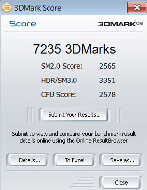 Посмотрим, как проявила себя система в популярном синтетическом тесте 3DMark 2006. При исследовании графики в компьютерных играх ноутбук Sony VAIO VPC-EA3S1R набрал 7235 баллов. Из них: SM2.0 Score – 2565, HDR/SM3.0 Score – 3351, CPU Score – 2578 баллов.