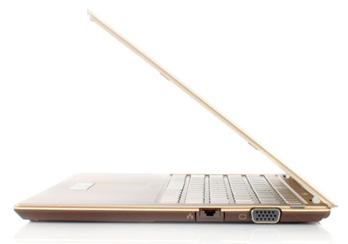 Оптический DVD-привод в нетбуке по понятным причинам отсутствует, поэтому места для видеовыхода VGA и сетевого разъема RJ-45 (со скоростью передачи до 1000 Мбит/с) на правой грани предостаточно.