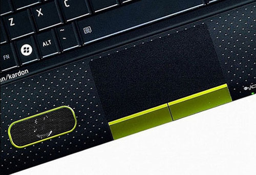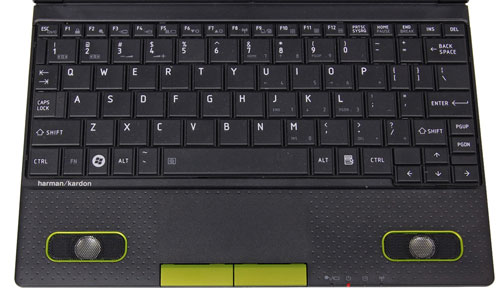 Оригинальным решением можно считать расположение акустической системы, представленной двумя стереодинамиками Harman Kardon с поддержкой технологии Dolby Advanced Audio. Они находятся не над клавиатурой, а по обе стороны тачпада на площадке для запястий. Как правило, многие считают, что раз нетбук, то уровень звука будет средним, ничем не примечательным. Так вот, в Toshiba NB550D качество звука будет отличным, притом, искажения на высокой громкости ощущаться не будут.
