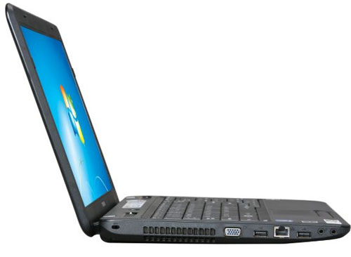 Правая сторона ноутбука SATELLITE C655D заполнена достаточно скромно. Здесь можно увидеть только внутренний оптический привод и гнездо питания. Стоит отметить, что накопитель DVD-SuperMulti может поддерживать до 11 различных форматов, в числе которых запись и воспроизведение двухслойных дисков.