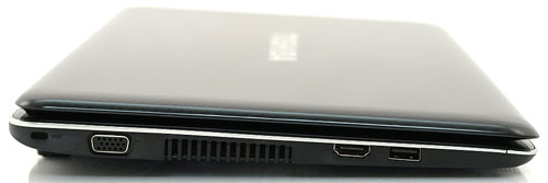 На левой стороне ноутбука находится немного интерфейсов. В их числе порт USB 2.0, предусмотренный для подключения периферийного оборудования, HDMI, необходимый для передачи цифрового сигнала. Также справа расположен аналоговый видеовыход VGA для подключения внешнего дисплея.
