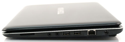 Справа интерфейсов намного больше. Здесь можно увидеть не только два USB 2.0 и сетевой разъем RJ-45, но и два линейных адаптера для подключения микрофона и наушников. Не обошлась правая сторона без гнезда для подзарядки и кардридера 6-в-1, читающего форматы SD/SDHC/MS/MSP/MMC/xD.