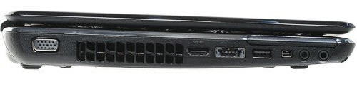 Левая часть нисколько не уступает правой. Здесь есть видеовыход VGA, цифровой порт HDMI, два USB, один из которых совмещен с eSata. Левая грань также предусматривает слот расширения Expresscard, читающий 34 мм карты памяти, линейные разъемы и порт FireWire.