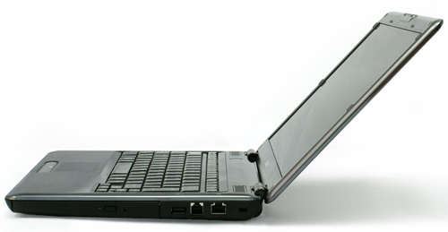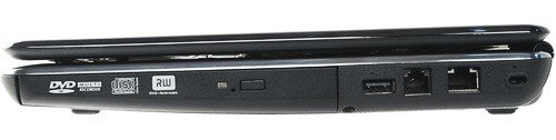 Справа для подключения периферийного оборудования разместились два интерфейса USB 2.0. На этой же грани осталось место для кенсингтонского замка, встроенного оптического накопителя Dual DVD-RW и двух разъемов: сетевого RJ45 и модемного RJ11. Стоит отметить, что порты USB могут поддерживать функцию Sleep-and-Charge, благодаря которой возможно подзаряжать различные устройства, не только в режиме ожидания, но при выключенном ноутбуке.
