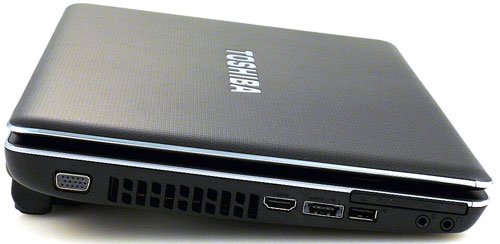 Слева сосредоточены 15-контактный выход VGA для подключения внешнего монитора, цифровой интерфейс HDMI, два порта USB, один из которых совмещен с eSATA, и два аудиоразъема. Кроме этого, на левой грани размещается универсальный слот ExpressCard/54 и даже нашлось место для вентиляционного отверстия.