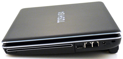 Интерфейсов в ноутбуке установлено достаточно. Они занимают место на боковых гранях. На правой стороне ноутбука основное место занято встроенным приводом DVD-SuperMulti Double Layer. Возле него находятся сетевой и модемный разъемы, а также порт USB 2.0 и гнездо для подзарядки. В самом конце правой грани расположено отверстие Кенсингтонского замка.